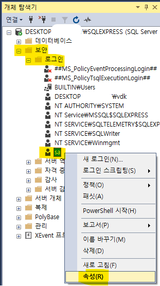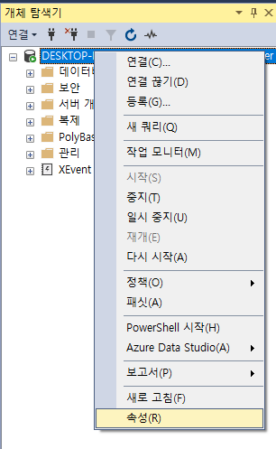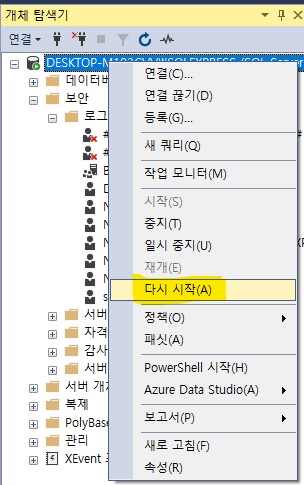 서버명에 우클릭 다시시작(A)을 해줍니다.