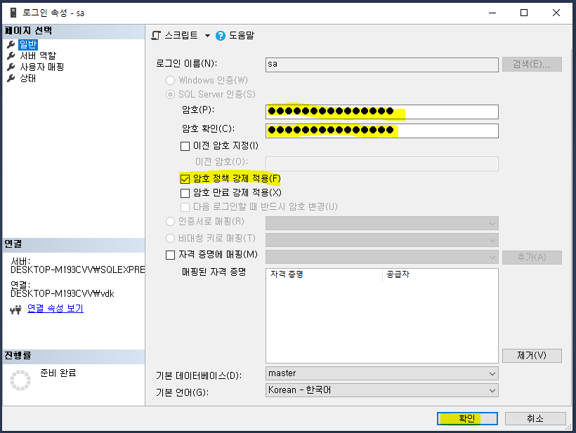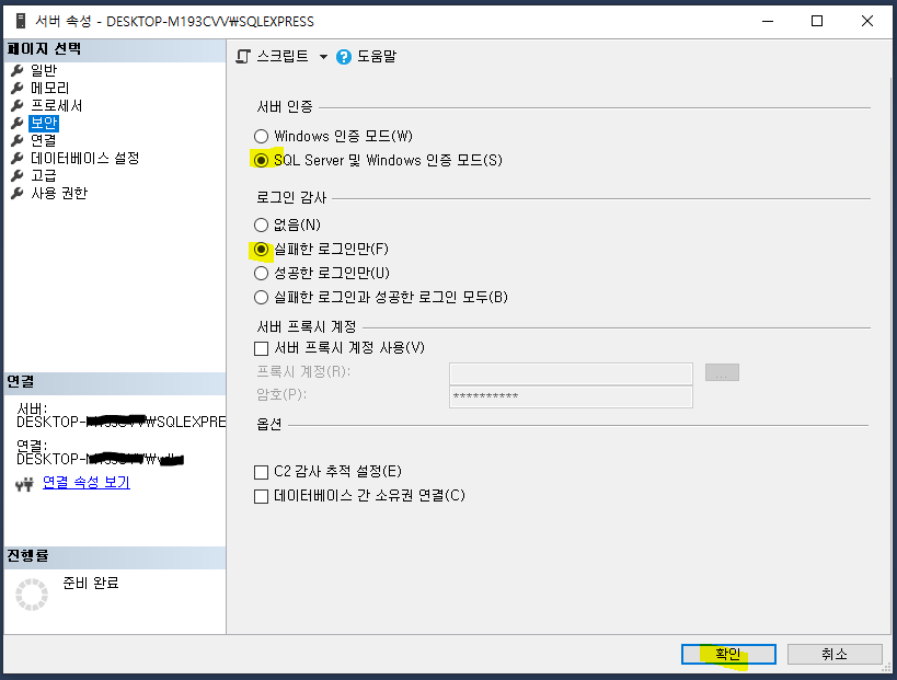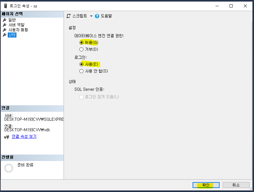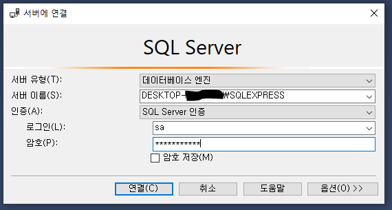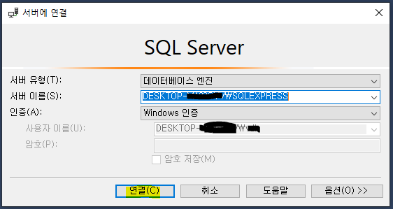 인증 부분을 보면 windows 인증인 상태로 연결을 한다.