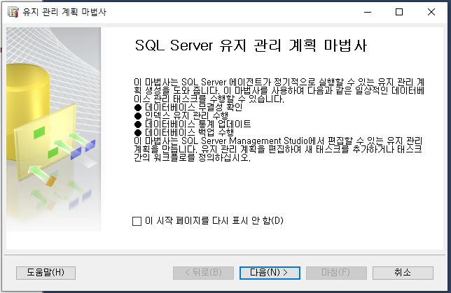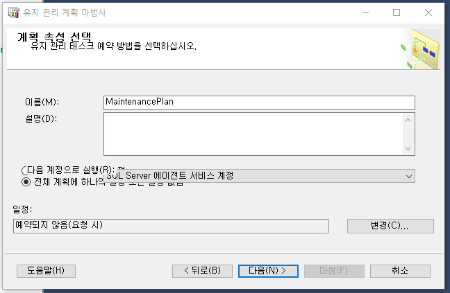 관리 폴더 + 표시를 열면 유지 관리 계획이라는 폴더가 나온다. 우클릭해서 유지관리 계획 마법사를 실행한다.