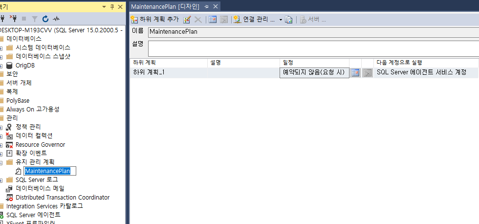 유지 관리 계획 폴더 밑에 만들었던 파일이 보인다. 더블클릭하면 우측에 이름이 같은 창이 뜬다.