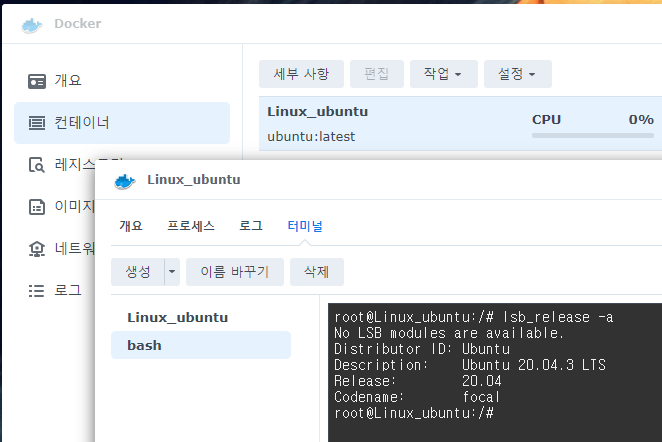 설치한 리눅스 컨테이너(위 그림에서는 Linux_ubuntu) 더블클릭,