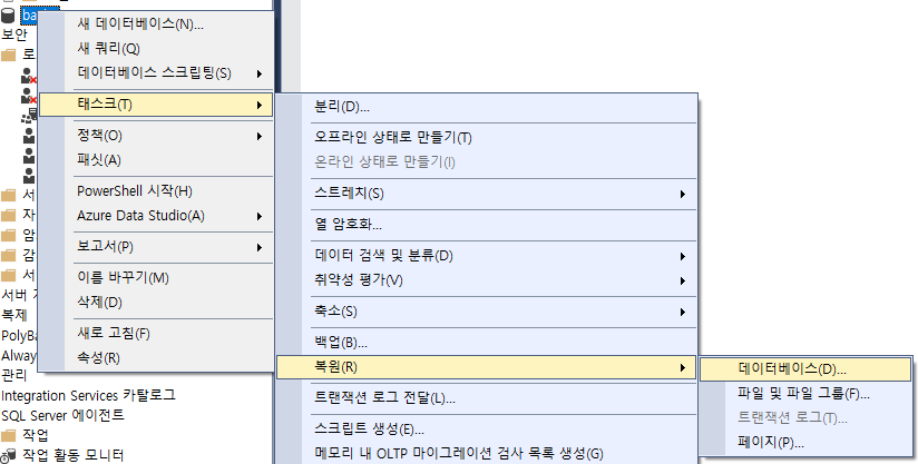 테스트용으로 백업파일이 잘 들어있는지 확인만 할거라 아무 DB에 우클릭으로 들어가도 관계없습니다.