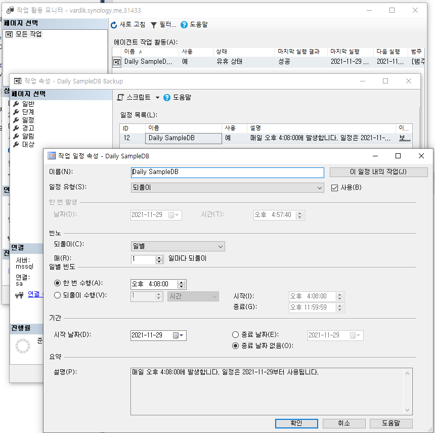 아래의 경로로 작업 일정 속성을 수정하면, 원하는 시간에 백업을 자동으로 받을 수 있습니다.
