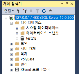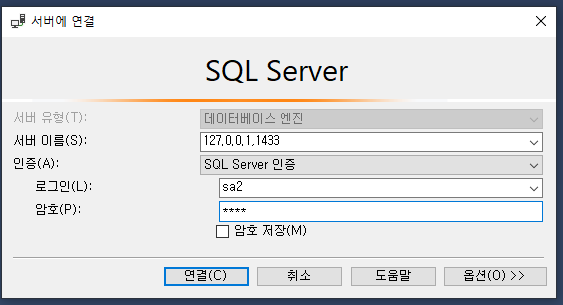 - 서버이름: 127.0.0.1,1433