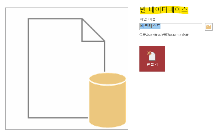 위는 Ms Access의 새 파일 만들때 나오는 화면입니다. 노란줄 친곳을 보시면 빈 데이터 베이스 만들기라는 걸 보실수 있습니다. MS Access는 DB를 구동하는 프로그램이란걸 알수 있지요.