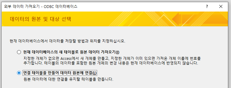 아래쪽 '연결 테이블 만들어 데이터 원본에 연결'을 선택합니다. 그리고 확인.