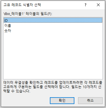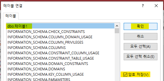 이미 올렸던 테이블 선택하고, 암호저장 체크 하고 확인 누릅니다.