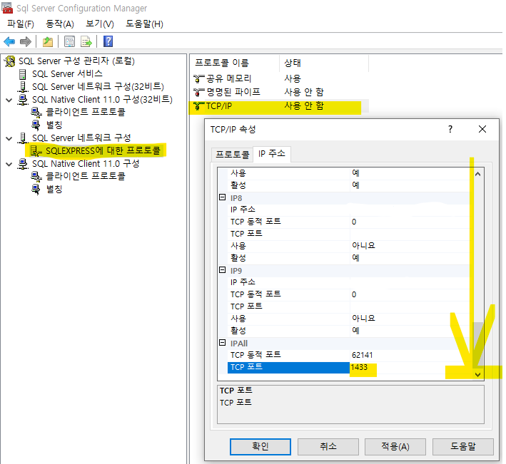 - 스크롤 가장 아래로 내려서 IPALL 부분의 TCP 포트 1433 적고 적용