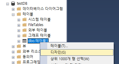 올린 테이블1인 dbo_테이블1에 우클릭해서 디자인을 클릭해줍니다.