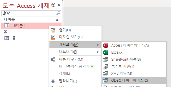 이번엔 가져오기입니다. 그림의 경로로 ODBC 데이터베이스를 클릭합니다.