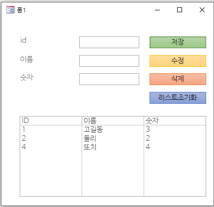 이런식으로 폼을 만들었습니다. 각 오브젝트의 이름은 텍스트 박스는 라벨에 씌여있는 대로, 버튼은 저장버튼의 경우 ‘버저장’ 이런 식으로 앞에 ‘버’붙였고, 리스트는 ‘리스트’입니다.