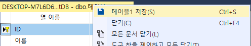 ctrl + S 나 마우스 우클릭으로 테이블을 저장해줍니다.