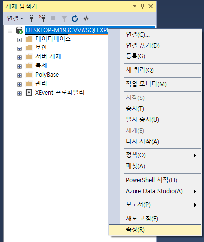 서버명 우클릭 속성으로 가서
