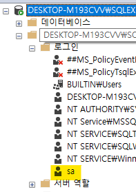 보안 폴더를 클릭하고 SA계정을 확인합니다. 활성화 안하신분들은 빨간 x표가 있습니다.