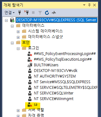 보안 폴더를 클릭하고 SA계정을 확인합니다. 활성화 안하신분들은 빨간 x표가 있습니다.