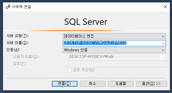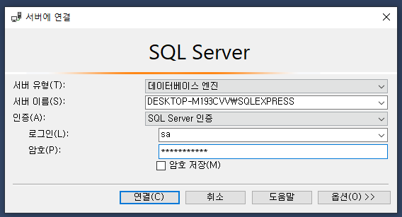 로컬 서버에 계정 로그인 방식인 "SQL server 인증 방식"으로 로그인을 해보겠습니다.
