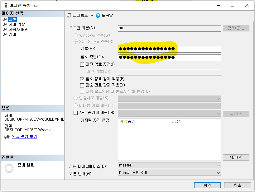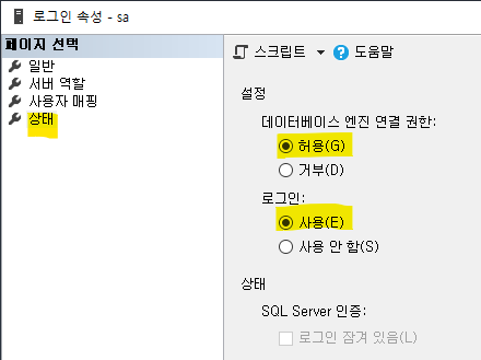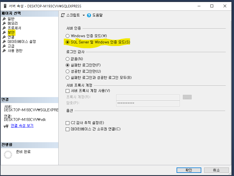 보안 탭에 "SQL Server 및 Windows 인증모드"로 바꿔주고 확인 누릅니다.