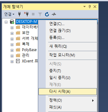 그 다음 서버명에 우클릭후 "다시 시작"을 꼭 해줍니다.