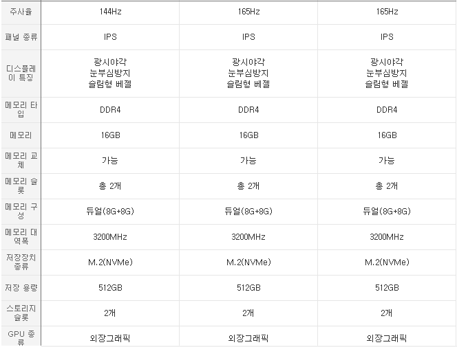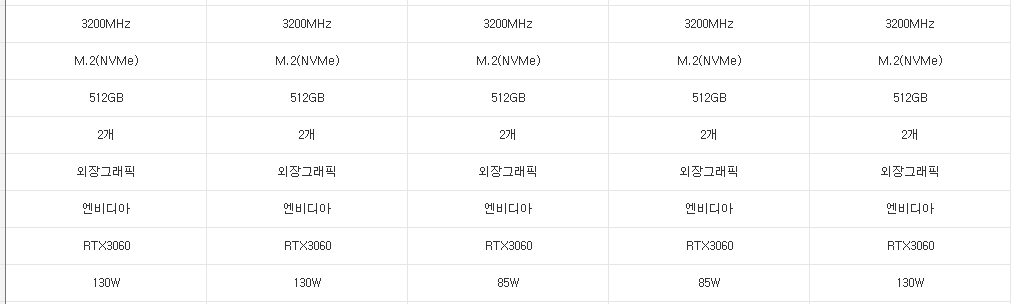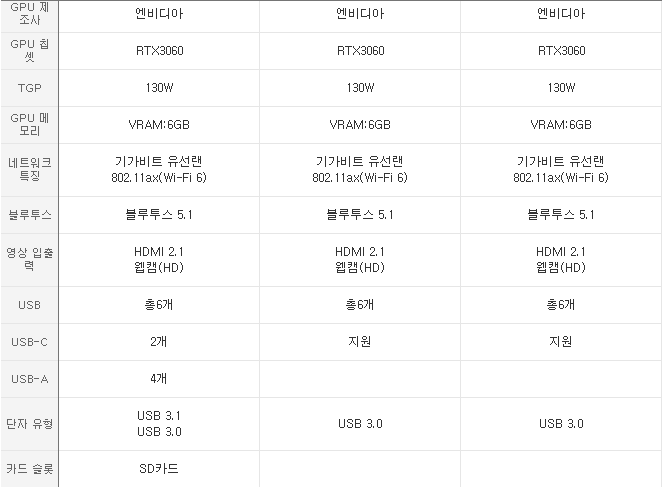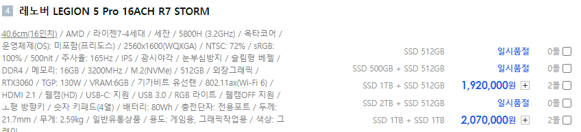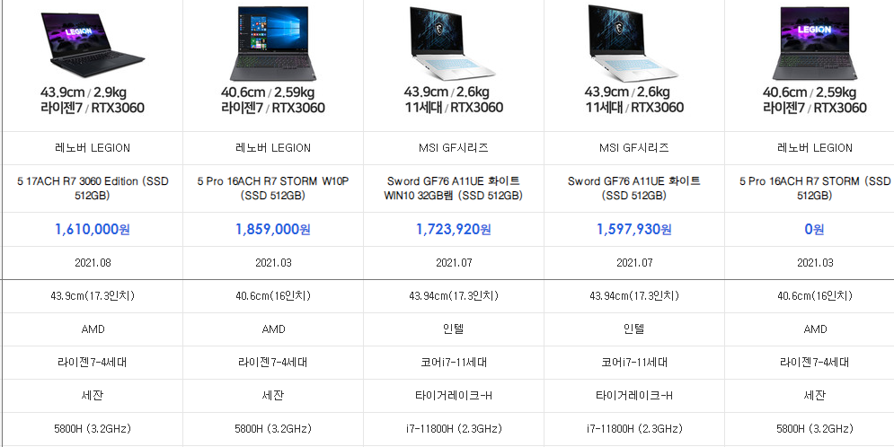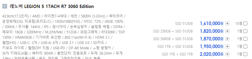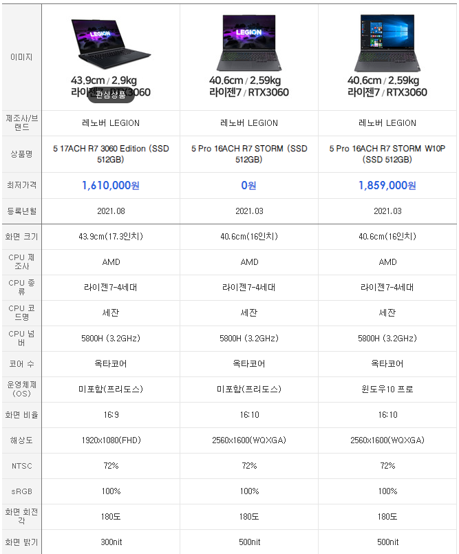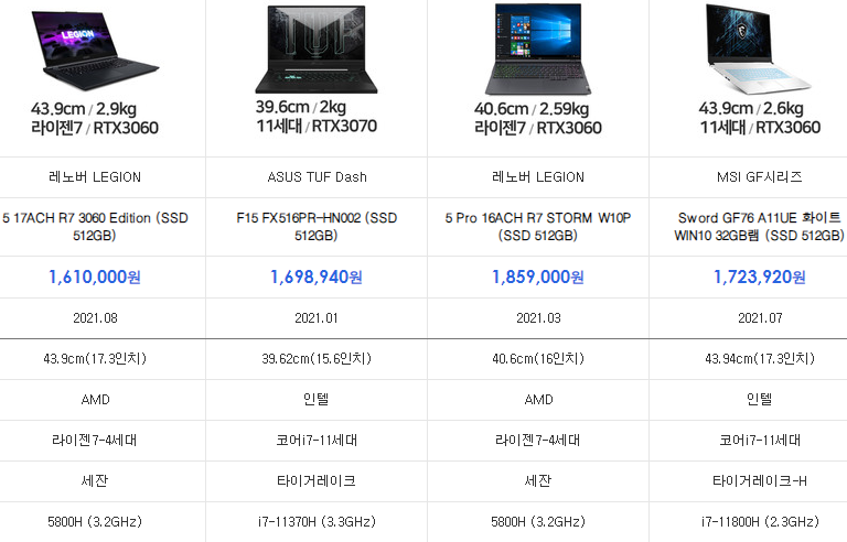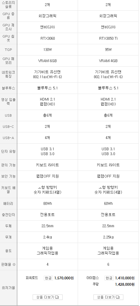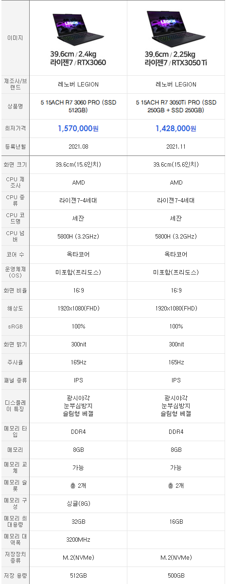 쭉 보니...제가 찾던 조건을 충족하는 모델은 이놈(왼쪽)인것 같습니다. 레노버 LEGION 5 15ACH R7 3060 PRO (SSD 512GB) 보통은 이쯤에서 예산으로 3050ti로 고민을 하다가 조금 더 싼걸 사는데 가격을 보면 14만원 정도 차이가 납니다. 14만원의 차이가 어디서 나는지 찾아보겠습니다.