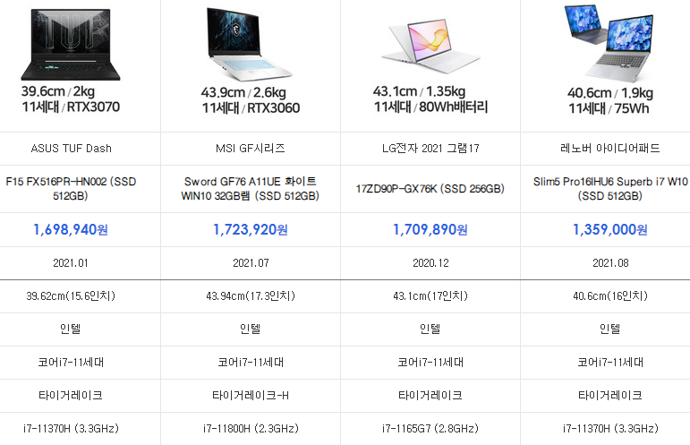 현재 i7-11세대 조건으로 노트북중에 인기순 1위에서 4위까지 다나와 리스트입니다. (CPU단일 조건입니다.)