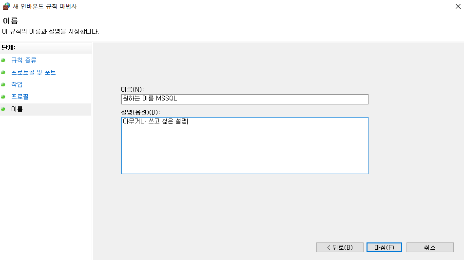 이름에 쓰고싶은 이름, 설명에 쓰고 싶은 설명, 마침 클릭.