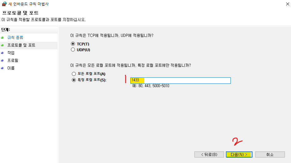 포트는 1433과 80 포트를 개방한다. 80은 web통신용으로 iis 테스트용으로 사용예정이다.