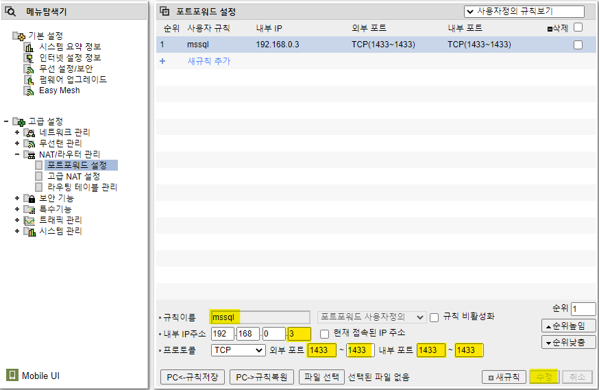 노란색 친부분을 작성해주고 '수정'부분 (아마 적용으로 되어있을겁니다.)을 클릭해주면 포트 포워드 설정이 적용됩니다.