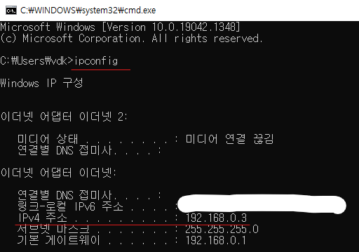 ipv4주소를 보시면 내 컴퓨터의 접속 ip가 192.168.0.3 이라는걸 알 수 있습니다.