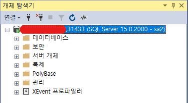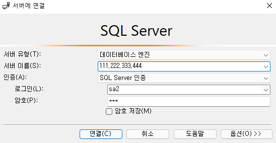 만약 위와 같이 화면이 동적아이피로 했을때 제대로 나왔다면 ,1443 포트를 열어놨으니 이번에는 SSMS로 접속해보겠습니다. 아니라면 이 아래 (B)를 봐주세요.