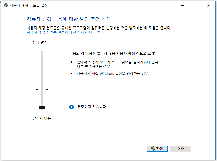 슬라이더를 가장아래 알리지 않음 으로 설정한다. 끝