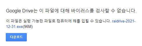 파일은 정식배포 파일이고 개인용도로 사용하는 구글드라이브라 아래와 같은 그림이 뜨더라도, 바이러스에 대한 걱정은 안하셔도 됩니다. 개인 용도로 사용하려고 준비한 레이드라이브 파일을 공유한 링크이고, 파일이 96M사이즈라 최초 다운로드 셋팅되는데 시간이 약간 소요됩니다.)