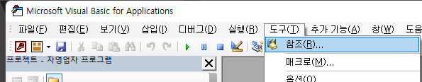 Ms VBA창이 나오면 도구 > 참조 클릭