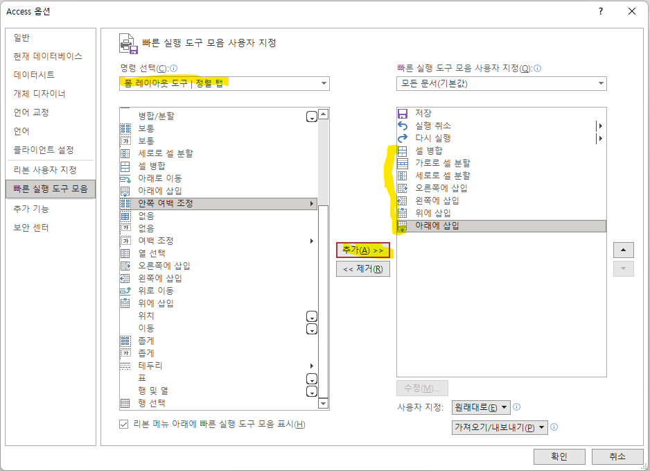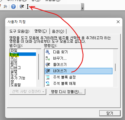 명령 탭의 편집을 클릭하시고 필요한 것들을 드래그 해서 끌어다 넣으면 됩니다.