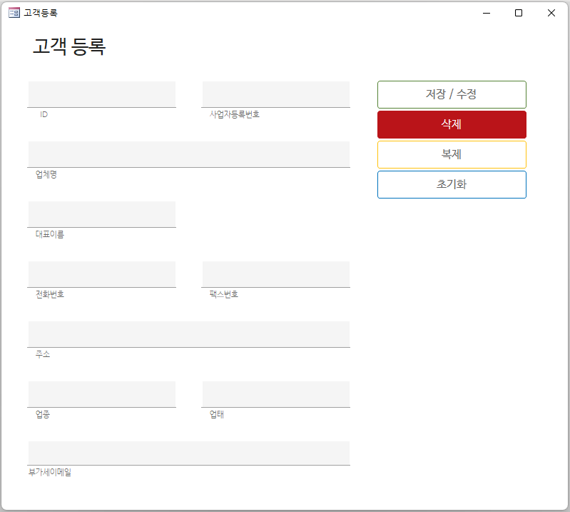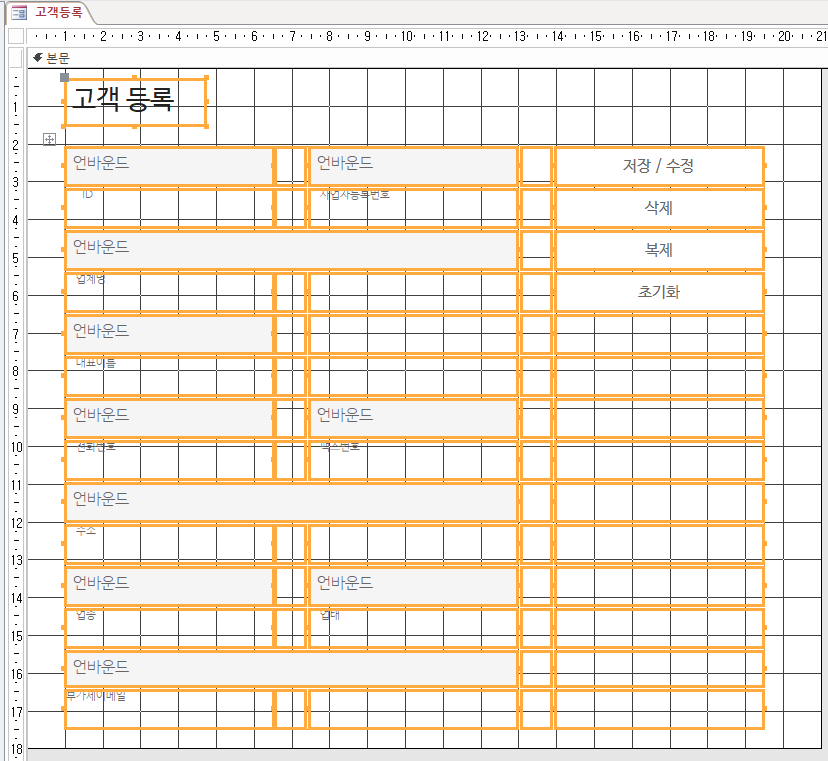 이제 모든 텍스트 박스의 이름을 레이블과 같게 만들어 주고, 버튼은 '버'라는 단어를 붙여서 버저장, 버삭제, 버초기화, 버복제 이런식으로 이름을 바꿔주겠습니다.