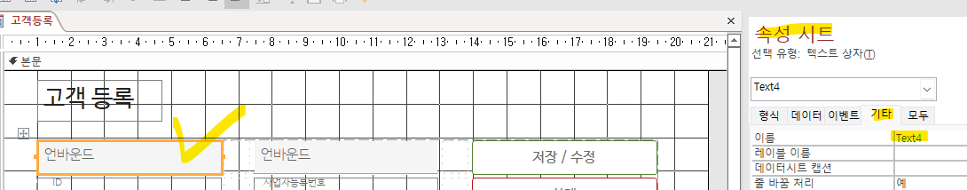 디자인 모드에서 텍스트 박스 하나를 클릭하고, 속성시트 > 기타 > 데이터를 보면 이 오브젝트의 이름이 Text4라는걸 확인할 수 있습니다.