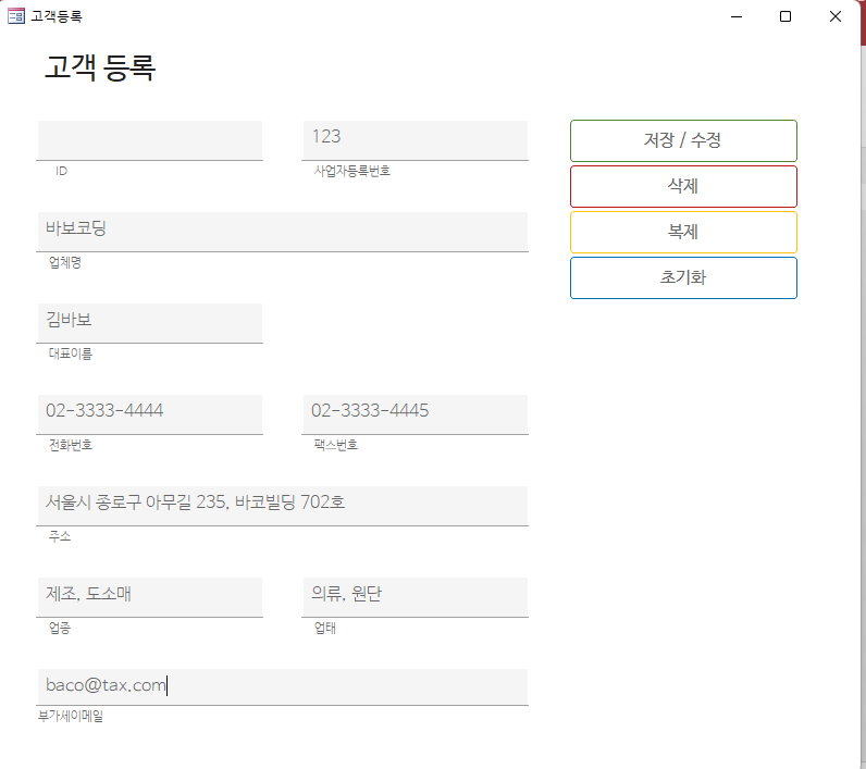 ", 주소, 업종, 업태, 부가세이메일) values ('" & 사업자등록번호 & "', '" & 업체명 & "', '" & 대표이름 & "', " & _