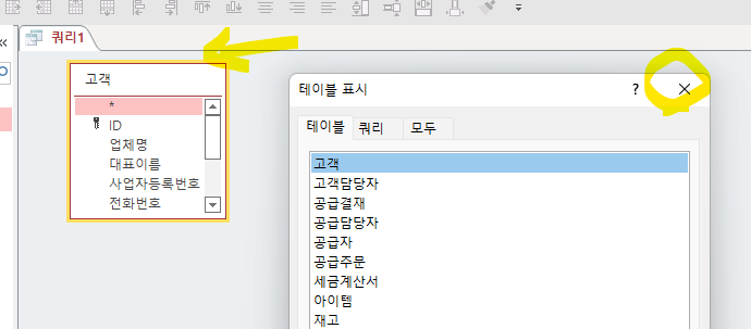 테이블 표시 창이 열리면, 테이블 이름인 고객을 더블클릭 하거나 고객을 선택한뒤 추가 버튼을 누릅니다.
