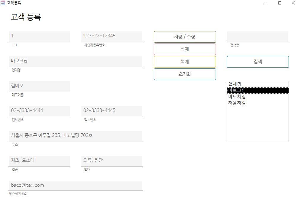 검색리스트.RowSource = "SELECT * FROM 고객 WHERE 업체명 Like '*" & 검색창 & "*'"
