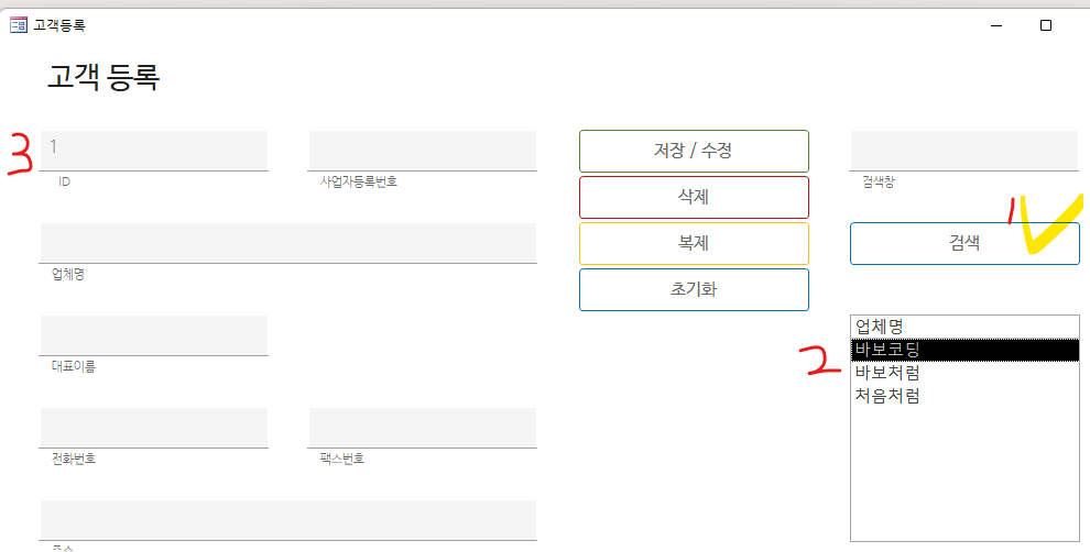 위의 코드는 생략된 부분들이 있는데, 본래 코드는 Me.ID = 검색리스트.column(0) 입니다.