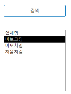 버검색을 누르면 검색리스트에 리스트가 나타나고(검색어가 없는 경우 전체 리스트가 나옴), 검색리스트에서 업체명을 클릭해주면, ID가 바뀝니다.