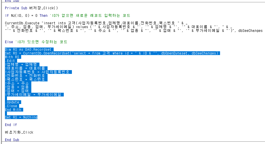 - !업체명 = 업체명 ( 원래는 RS!업체명 = me.업체명, RS!업체명은 테이블의 업체명, me.업체명은 오브젝트 업체명입니다. 우리는 테이블을 수정할 것이기 때문에 코드에 타겟이 먼저 나오고 소스는 나중에 나오는 순서를 기억해야합니다.