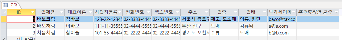 CurrentDb.Execute "insert into 고객(사업자등록번호,업체명,대표이름,전화번호,팩스번호 " & _