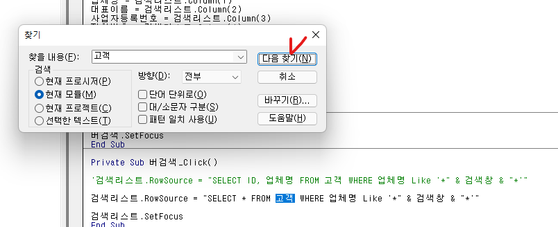 다음 찾기를 누르면서 검색을 계속 진행할 예정인데, 아래 그림을 보시면 테이블명인 고객에서 한번 멈춥니다.