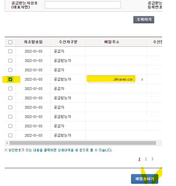 3) 나온 목록 중에서 좌측 체크 박스를 클릭하면, 박스가 체크 되면서 메일주소 칸이 수정할 수 있게 변경됩니다. 수정후 재발송하기 버튼을 눌러주세요.