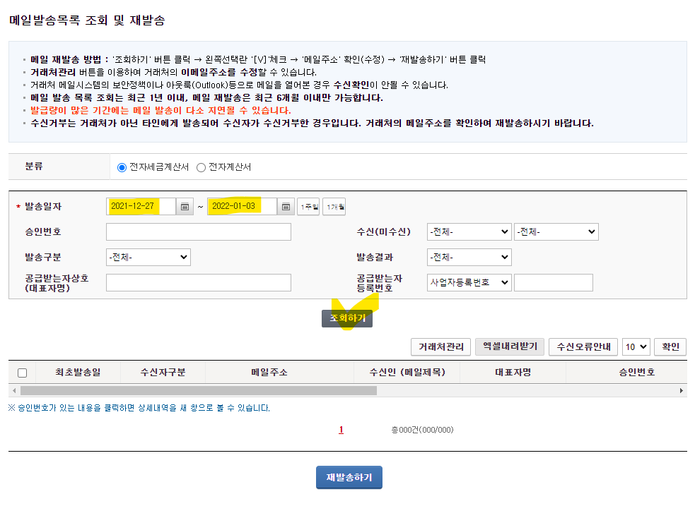 2) 발송일자를 선택해주시고, 조회하기를 클릭하면, 발송했던 세금계산서 이메일 목록이 나옵니다.