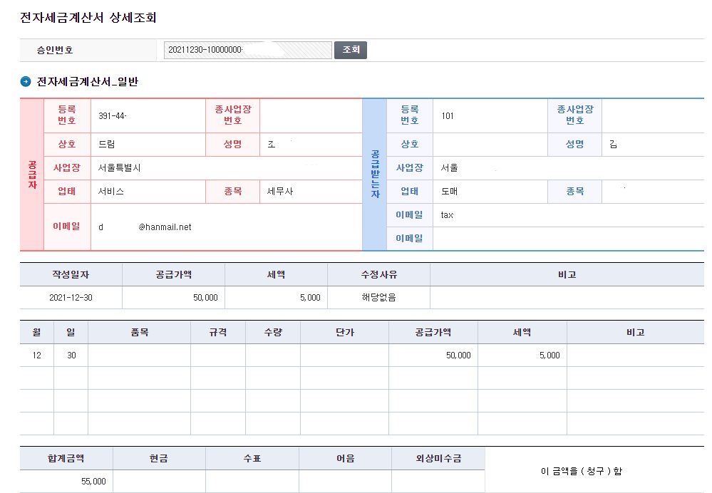 3) 아래 그림과 같이 발급된 세금계산서를 조회 할수 있습니다.