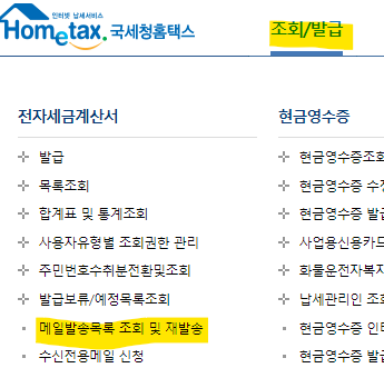 1) 조회/발급에 마우스를 올리시면 메일발송목록 조회 및 재발송을 클릭해줍니다.