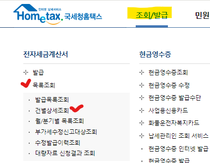 1) 조회/발급 위에 마우스를 올리시면 아래로 창이 하나 뜨고, 1) 목록조회 클릭 이후 나온 창에서 2) 건별 상세조회 클릭 을 합니다.
