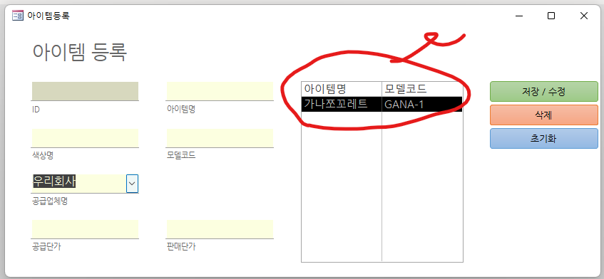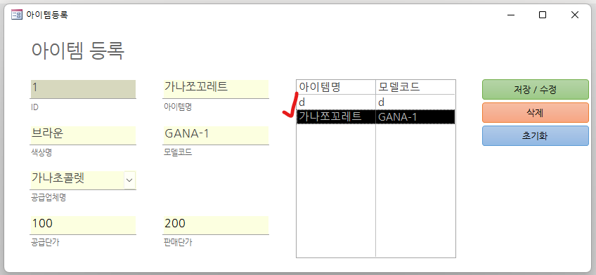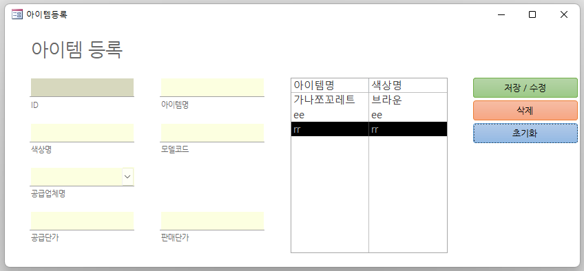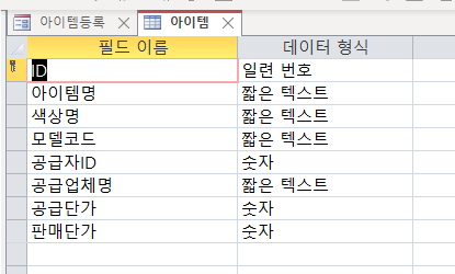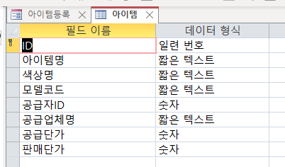 strSQL = "select 아이템.id, 아이템.아이템명, 아이템.색상명, 아이템.모델코드, 아이템.공급자ID, 아이템.공급업체명, 아이템.공급단가, 아이템.판매단가 from 아이템"