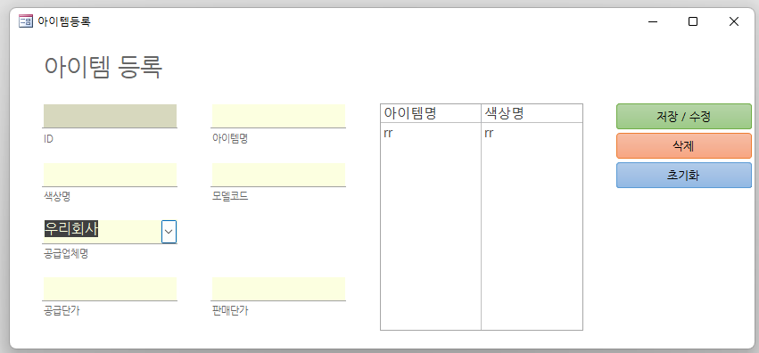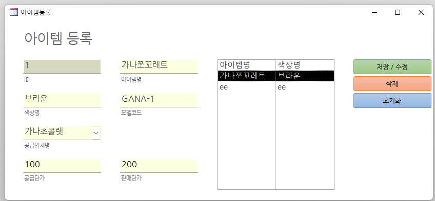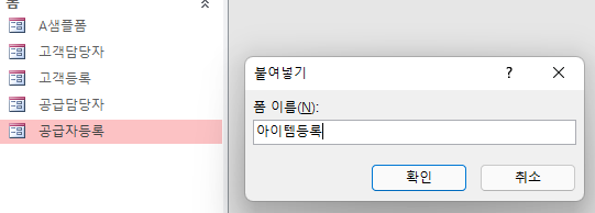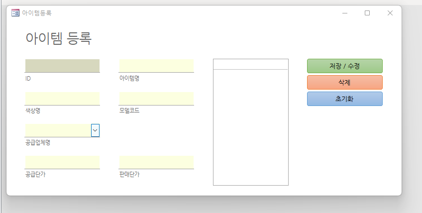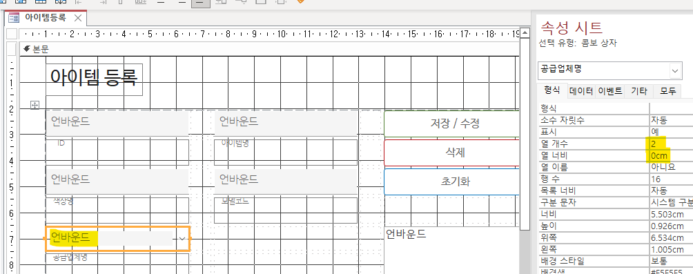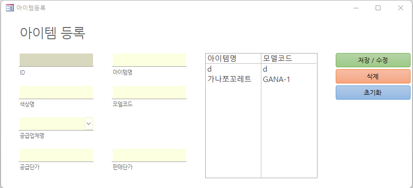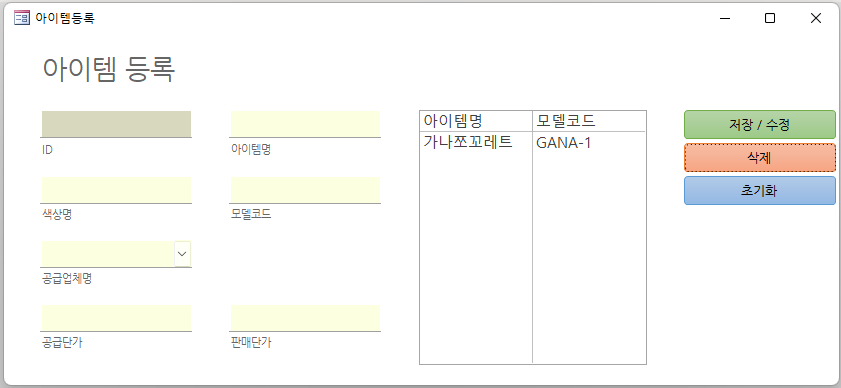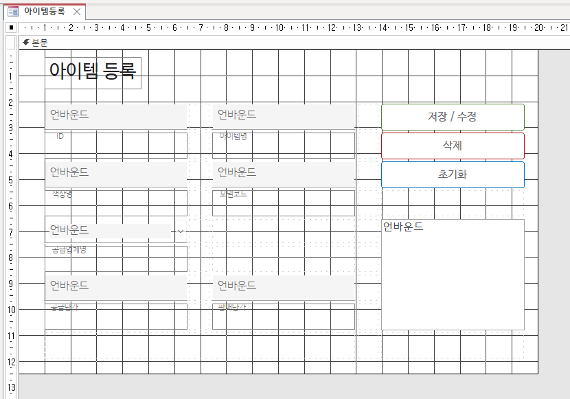 아이템등록폼을 디자인 보기로 열어 필요한 오브젝트만 남기고 나머지는 삭제 해줍니다.